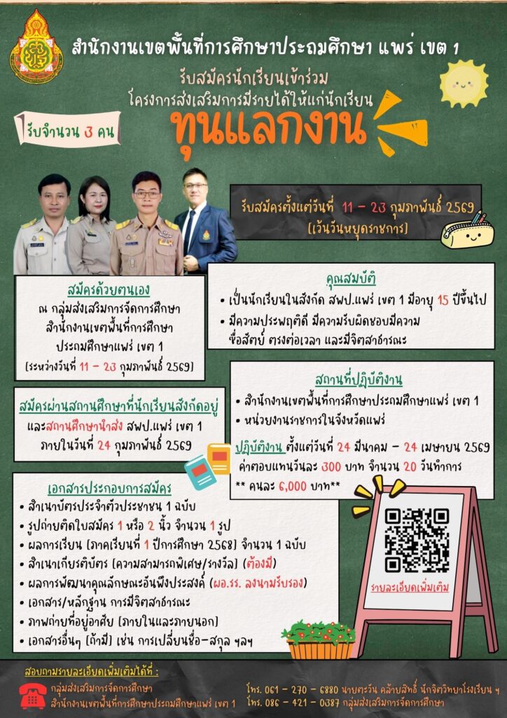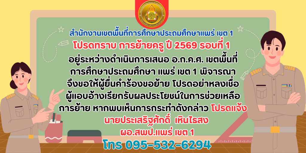 ประกาศ อ.ก.ค.ศ.เขตพื้นที่การศึกษาประถมศึกษาแพร่ เขต 1 เรื่อง การย้ายข้าราชการครูและบุคลากรทางการศึกษา ตำแหน่งครู สังกัดสำนักงานคณะกรรมการการศึกษาขั้นพื้นฐาน ประจำปี พ.ศ. 2569 (รอบที่ 1) ครั้งที่ 1